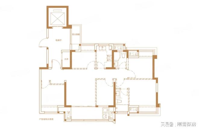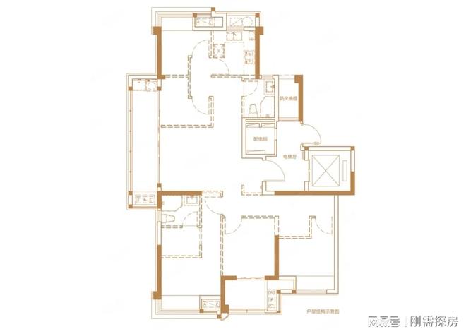 123平:4房2厅2卫,位于外端头,同样是主力产品,109平的升级版,足够做四房使用,餐厅、公卫、厨房进深都加大,相对面积合理一些,不过整体的户型就是比较中庸,看不到过多的亮点。此外,依然存在电梯对着入户的问题,