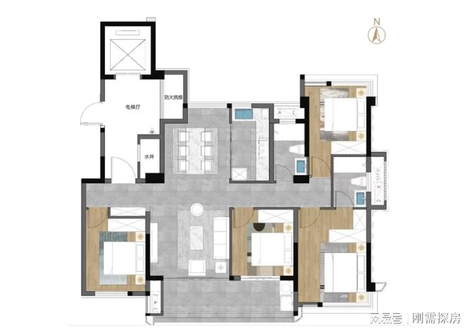 109平:4房2厅2卫,位于5号楼东端,108平的被横向拉宽了一些,客餐厅变成南北通透,不过依然做四房太局促,公卫+厨房面积也同样国小,此外就是电梯对着入户门,当年的建总领筑也有类似产品。