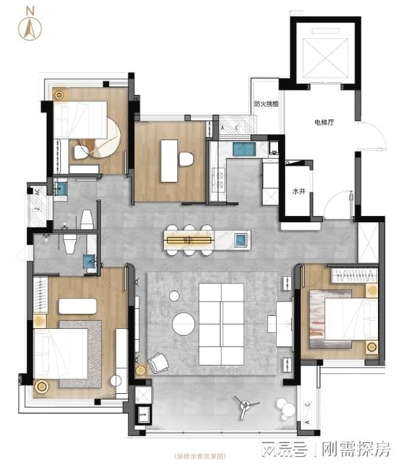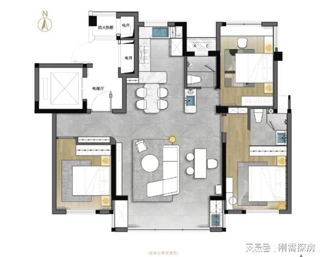 缺点在于餐厅没有独立空间,略微影响动线,南北无法做到完全通透,这个面积只能做到3.5房略显遗憾,公卫面积也一般,整体来说,公区占比过大,其他功能区空间都被压制。